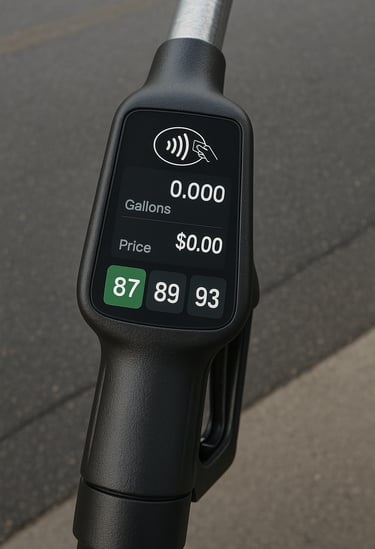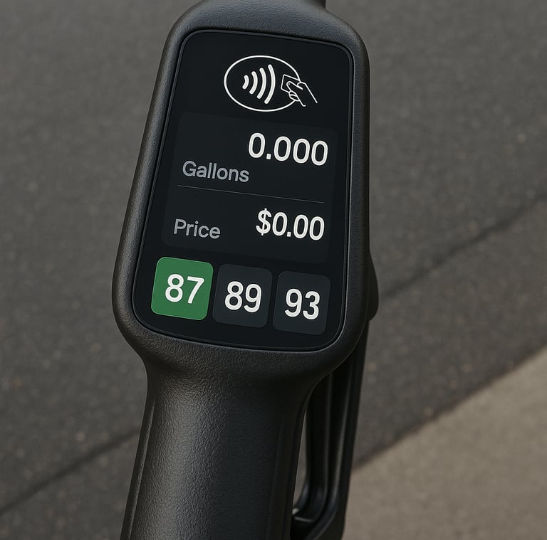 Gas Pump 2.0 reimagines the fueling experience by integrating all core functions: tap-to-pay, price display, fuel selection, and gallon tracking directly onto the nozzle.
