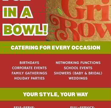 The Grit Bowls catering pamphlet was created as a vibrant, on-brand introduction to the company’s services. Headlined by the energetic tagline “Delicious fun in a bowl!”, the design reflects the playful spirit and bold flavors behind the concept.