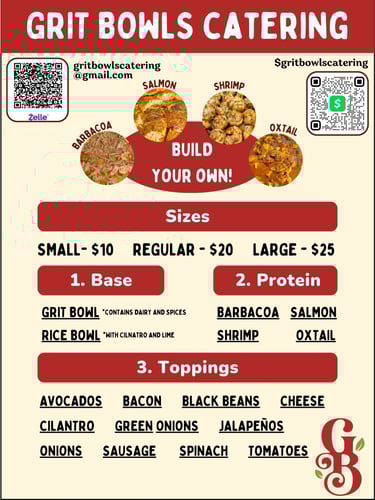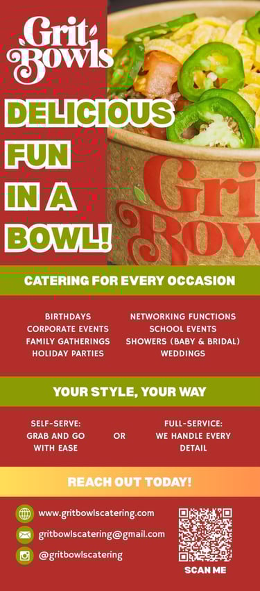 Grit Bowls Catering is a first-to-market food concept specializing in customizable grits-based bowls. Centered around the Southern comfort staple, the brand offers a unique fast-casual experience where customers can build their own bowl with a variety of unlimited toppings—ranging from savory proteins to fresh vegetables and sauces.
